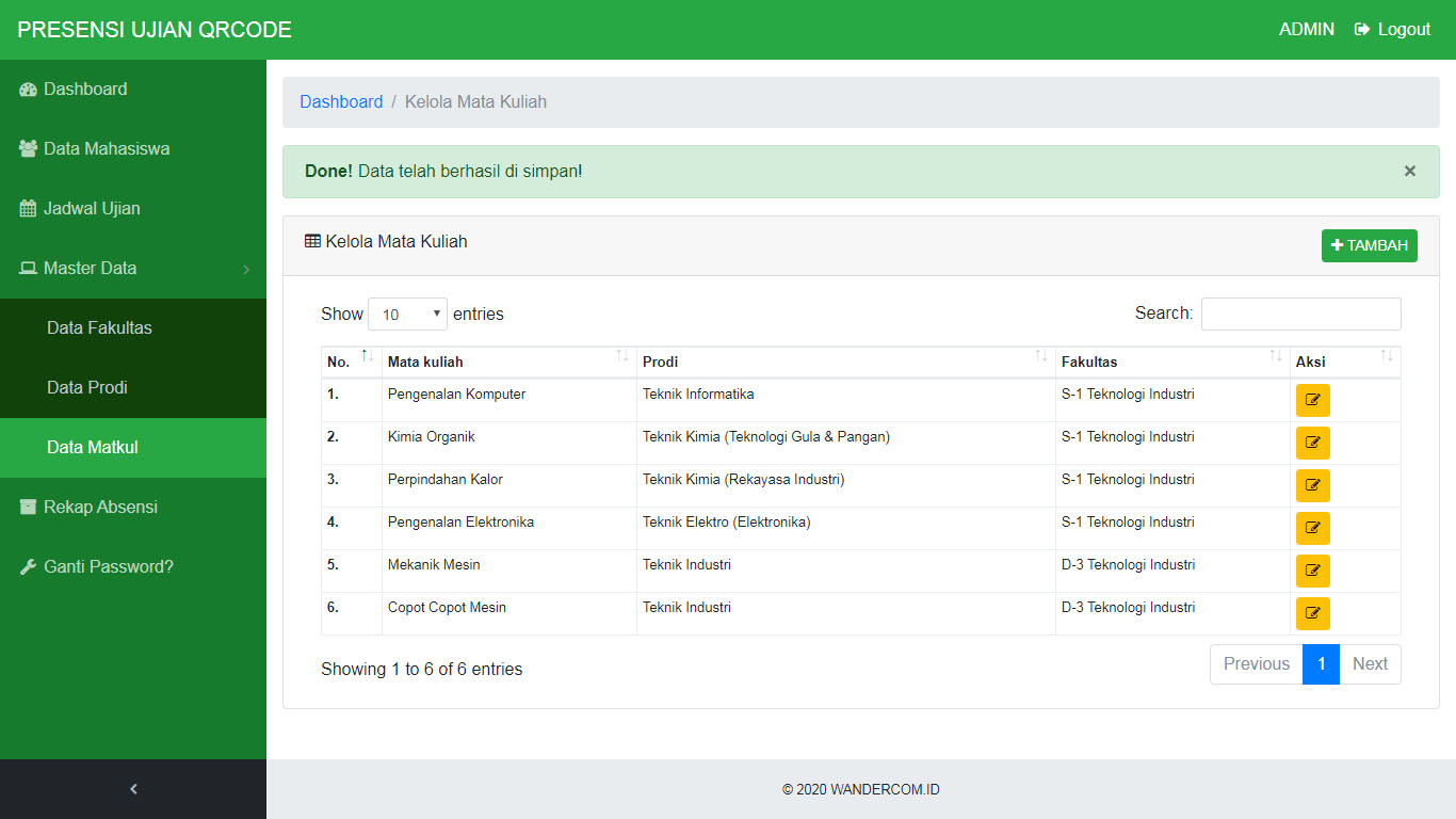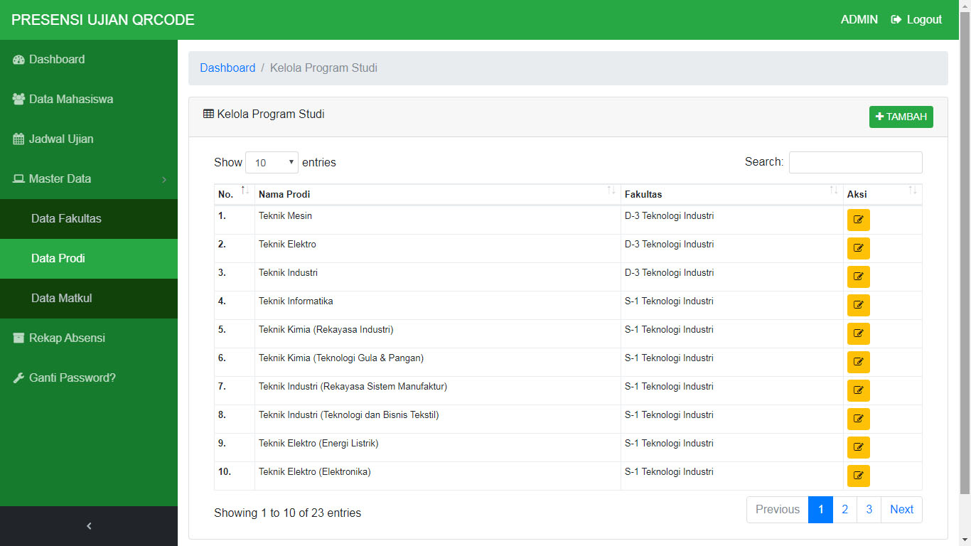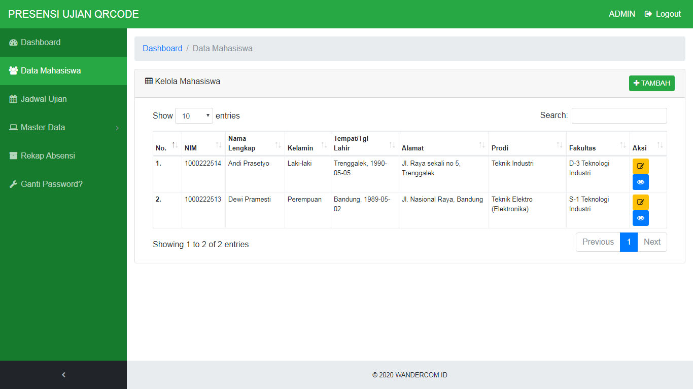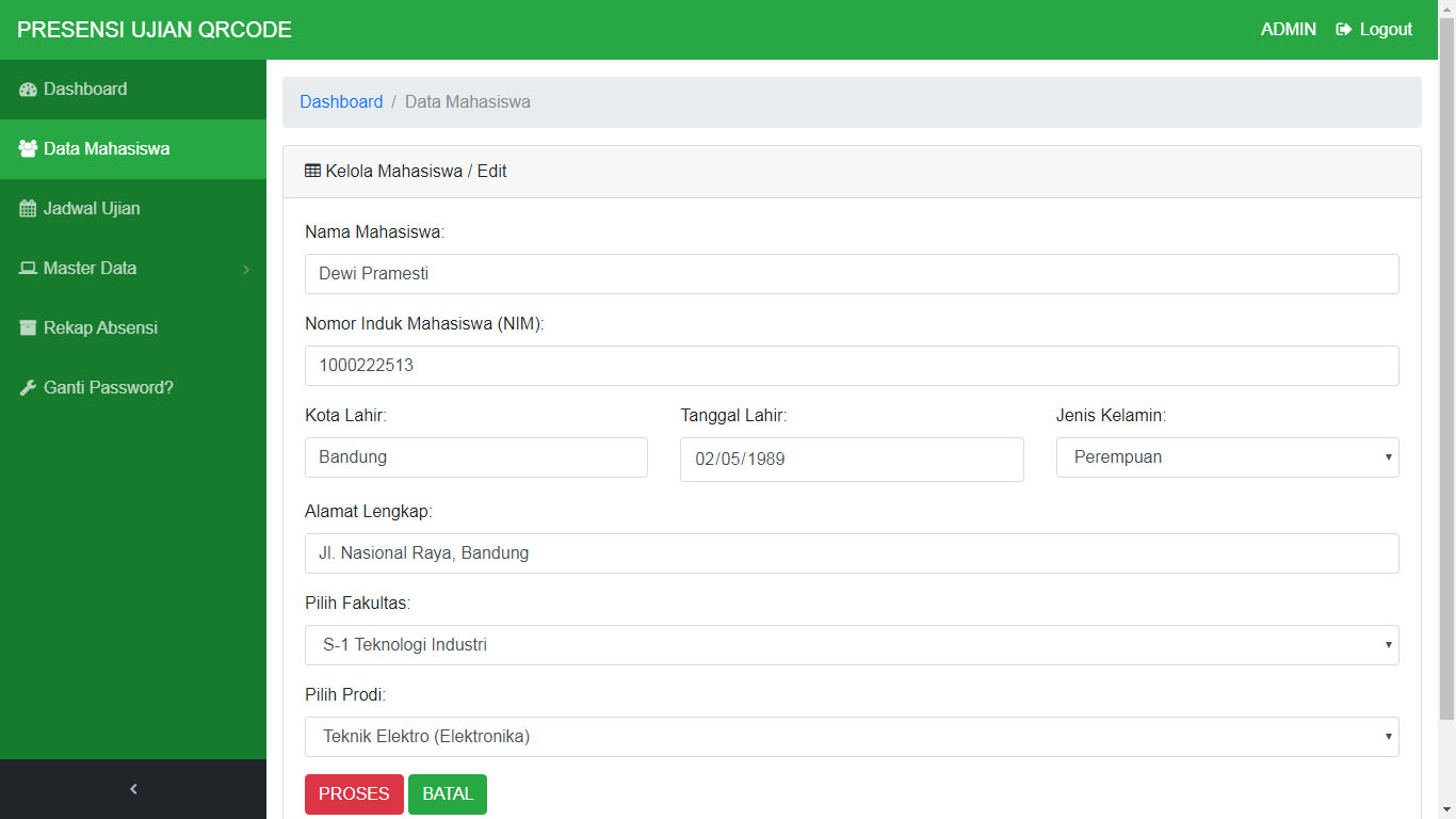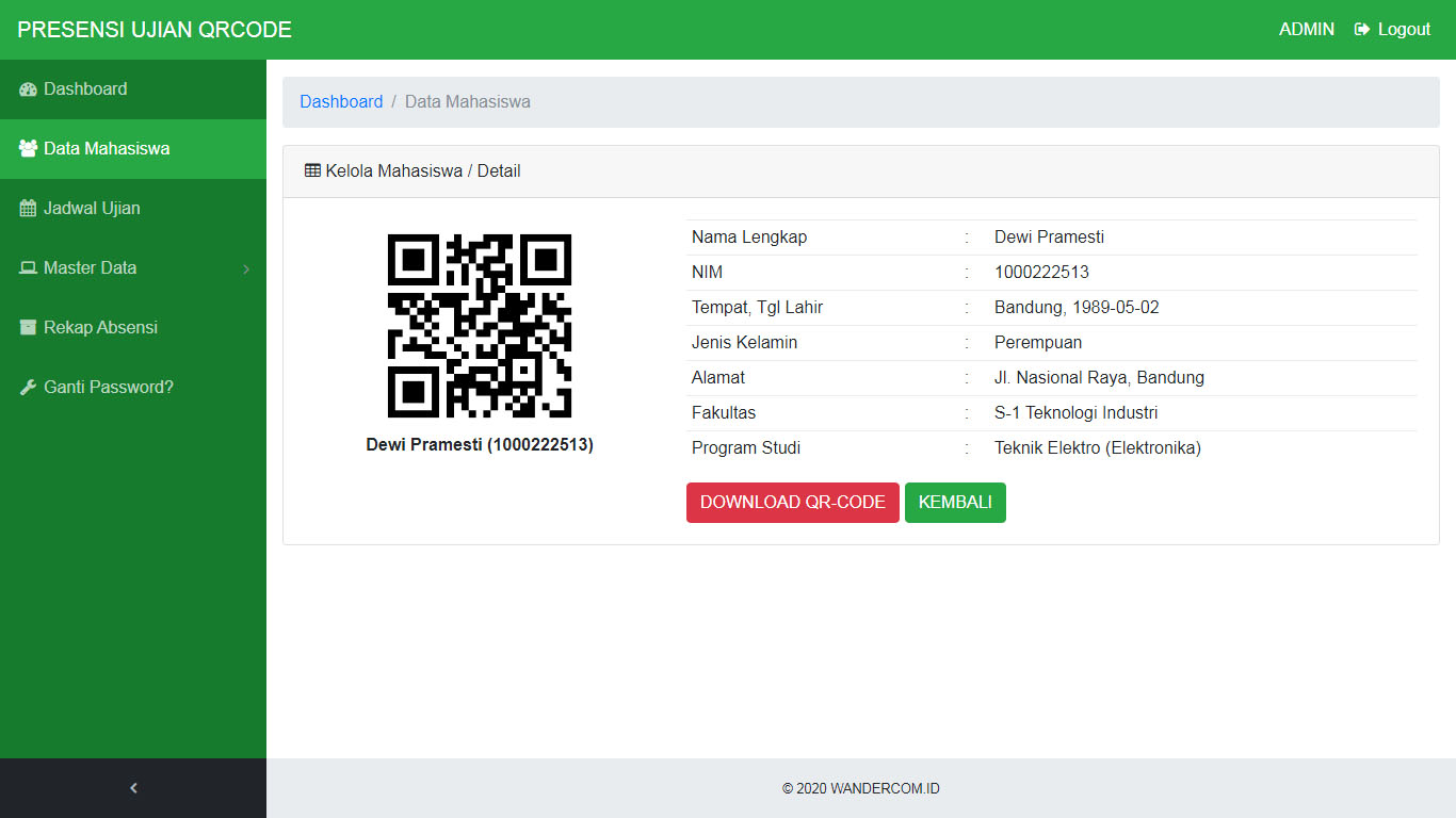 Setiap USER (mahasiswa) yang sudah didaftarkan di master data oleh admin, bakal punya QR Code masing masing, kemudian di buka di handphone masing masing, terus datang ke lokasi/tempat absen, melakukan scan qrcode ke webcam. oke lanjut ikut ujian jika absensi berhasil. 🙂