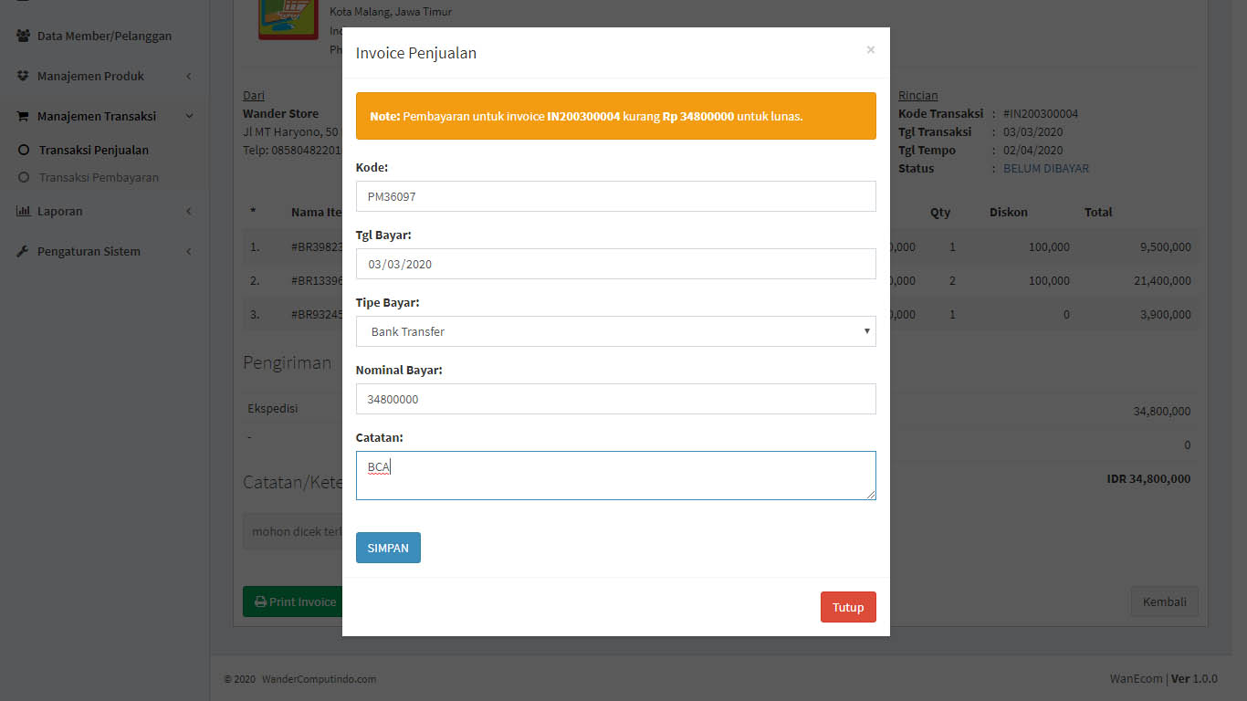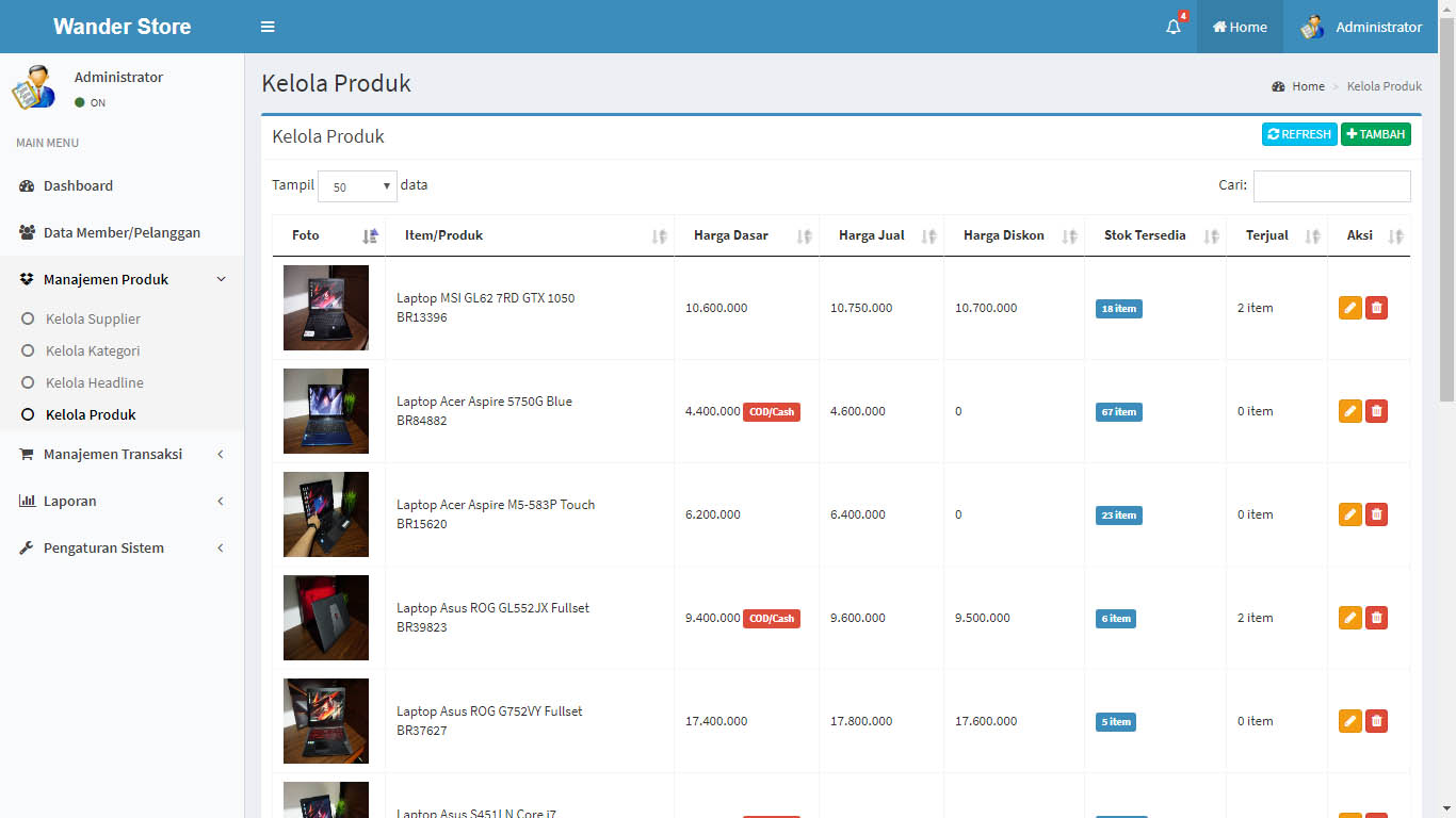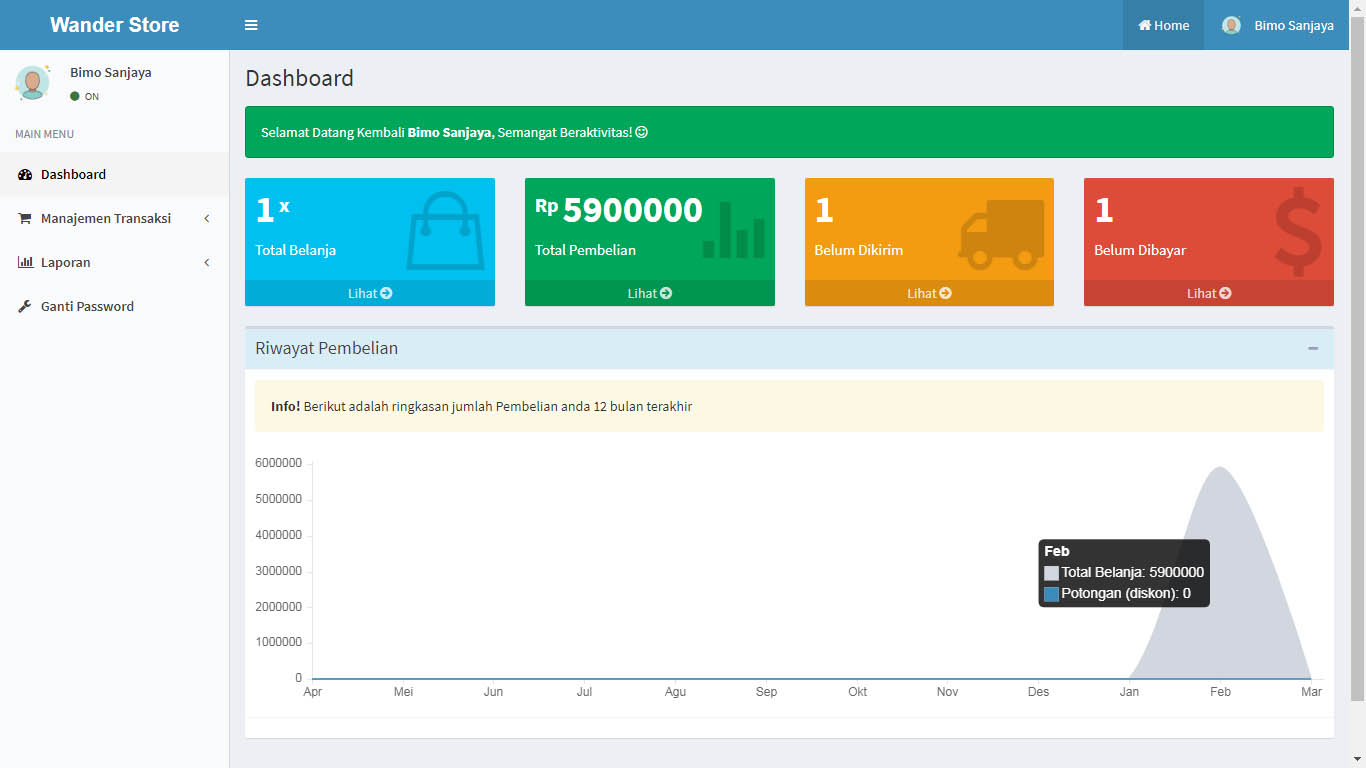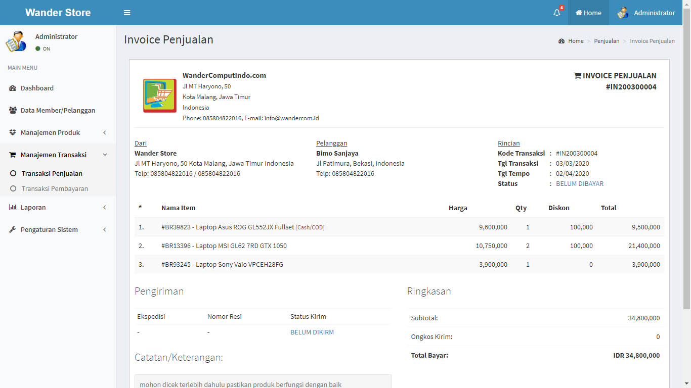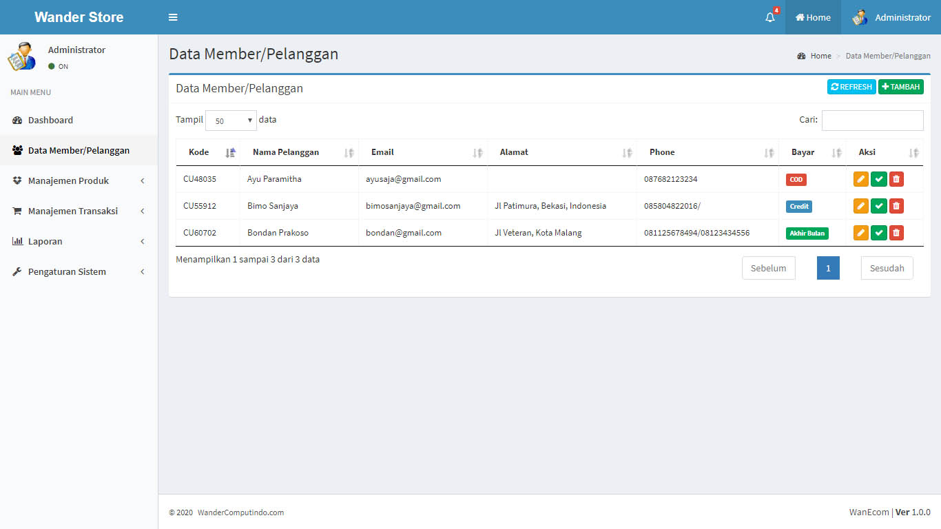WanEcom – WanderCom E-commerce adalah program atau aplikasi sistem informasi toko online berbasis website, dengan tampilan modern dan responsive memudahkan anda menjual produk dan mengelola penjualan, stock item, manajemen member/pelanggan, pengelompokan item dan mengambil laporan dalam format worksheet (excel).