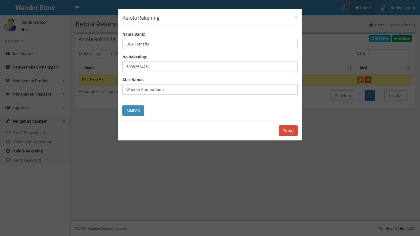 Kini Anda dapat membuat Toko Online dengan brand Anda sendiri, yang terhubung langsung dengan dashboard Admin Anda. Punya usaha penjualan hijab, laptop, atau peralatan lainnya? Tidak masalah. WanEcom bisa mencakup semua jenis usaha yang anda jual. Anda tidak perlu memikirikan perhitungan laporan manual yang saat ini dilakukan tentu saja sangat menghemat waktu, selain itu buat anda yang sedang memiliki banyak pelanggan atau member, di WanEcom juga tersedia modul member area yang memungkinkan anda mengelola member dengan mudah dan tentu saja efisien tidak akan lagi terjadi kehilangan kontak, bahkan riwayat transaksi setiap member bisa dipantau.