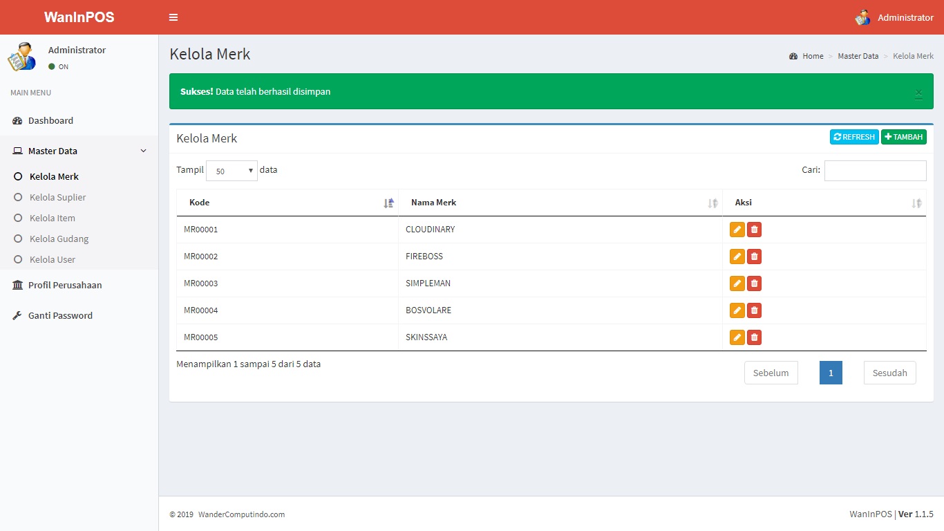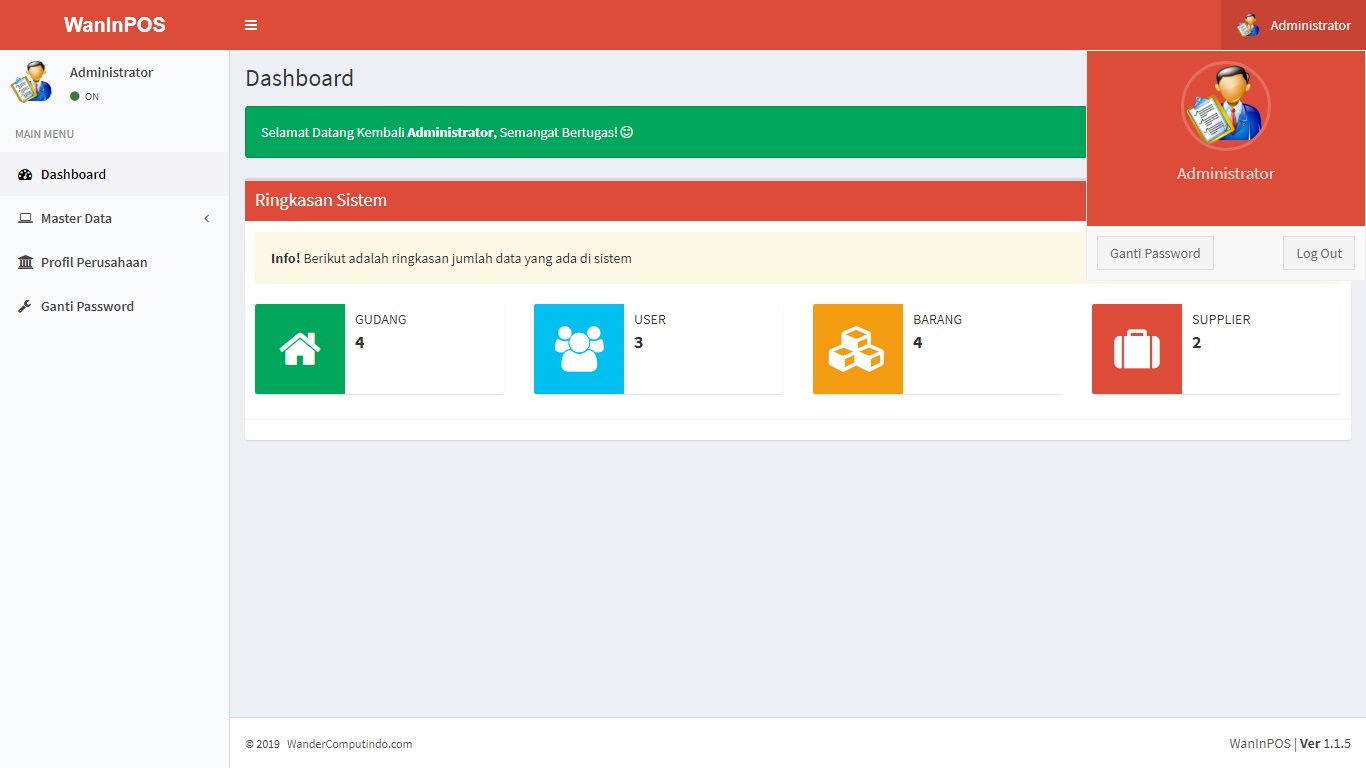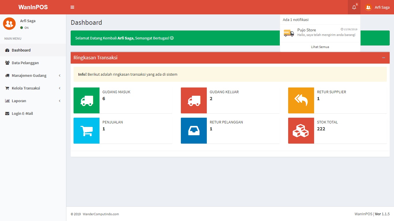WanInPOS – WanderCom Inventory and Point of Sales adalah program atau aplikasi sistem informasi manajemen gudang sekaligus penjualan berbasis website, dengan tampilan modern dan responsive memudahkan anda mengelola barang, stock item, pengelompokan item dan mengambil laporan dalam format worksheet (excel).