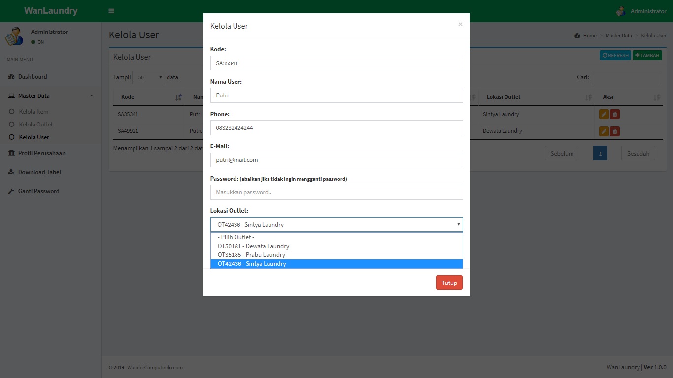Bisa memiliki lebih dari satu user login di setiap outlet, buat anda yang memiliki staff/karyawan lebih dari satu. Tidak masalah menggunakan WanLaundry adalah solusinya.